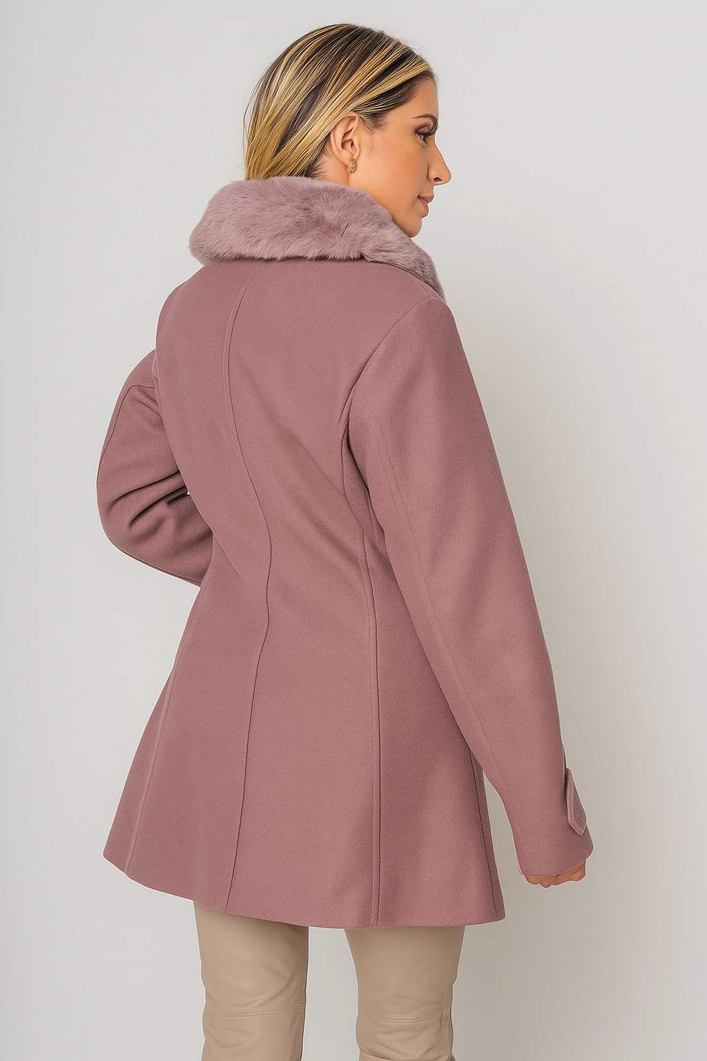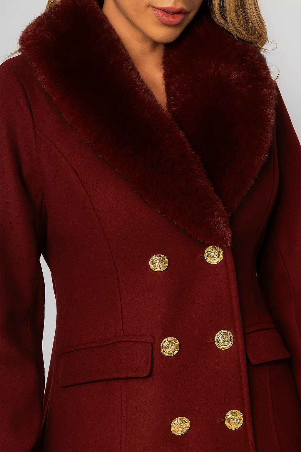 Casaco Midi Forrado Lã Batida Com Botões Dourados e Colarinho Felpudo Removível